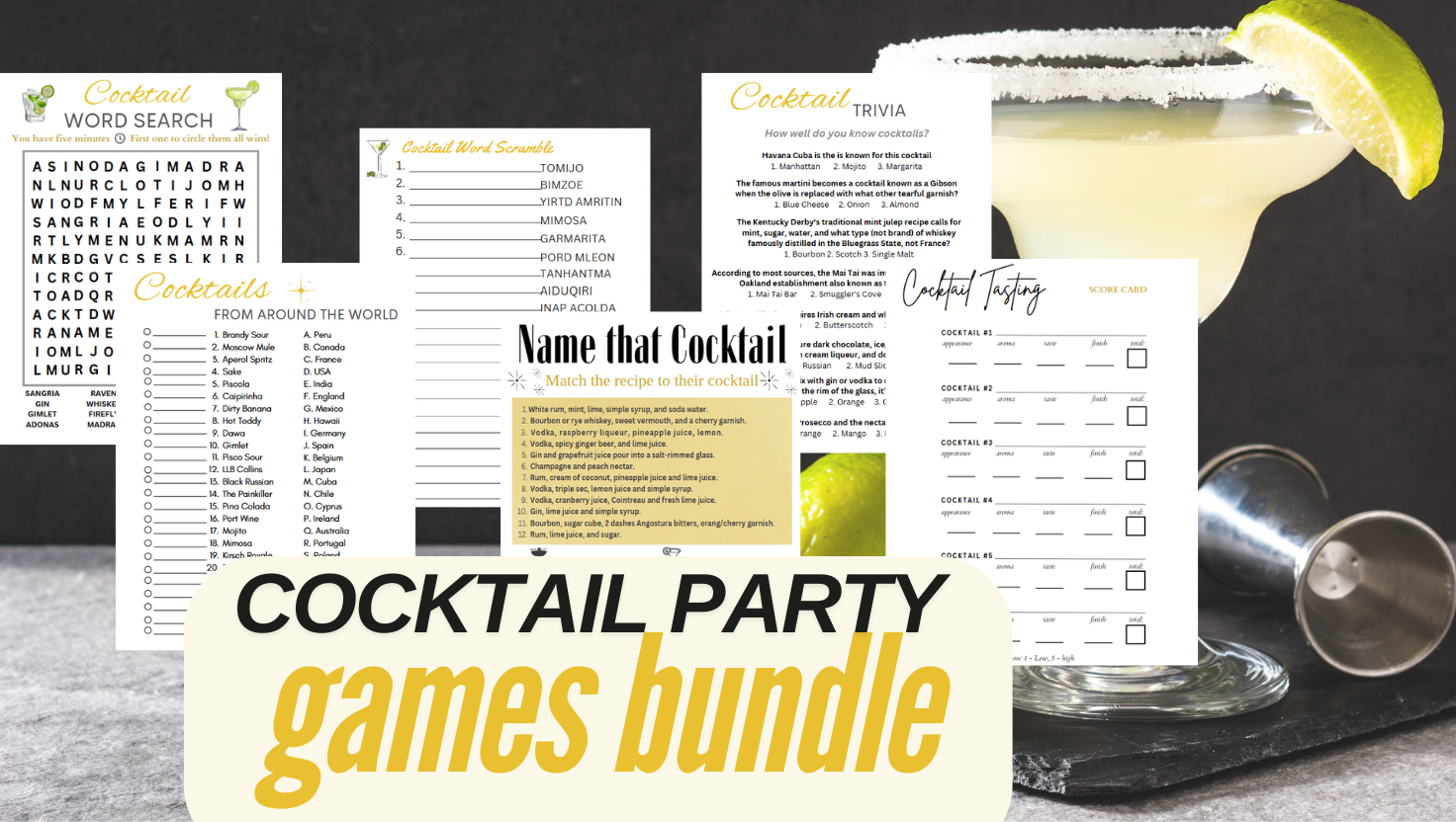 Name That Cocktail Game is a stylish adult party game perfect for all your adult get-togethers. Test your knowledge of standard cocktails! This game can be used at dinner parties, cocktail parties, bachelorette parties, happy hours, Great Gatsby-themed parties, bartending school graduation parties, and so much more! The game involves matching the recipe to its corresponding cocktail.