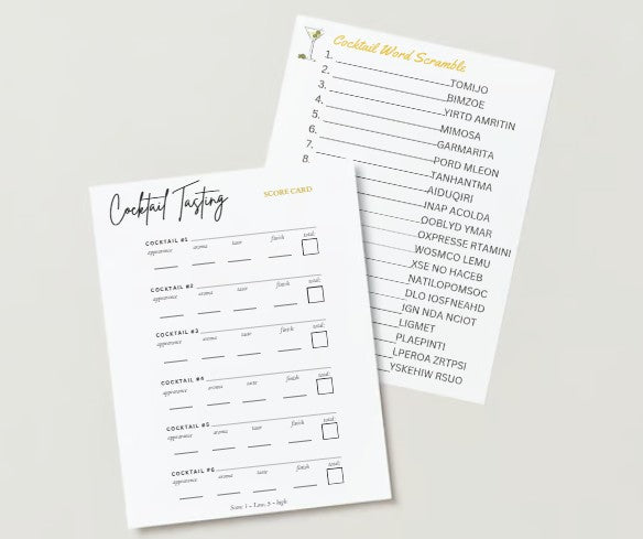 The Cocktail Tasting Game includes a scorecard, competition, tasting card, and drink rating sheet.